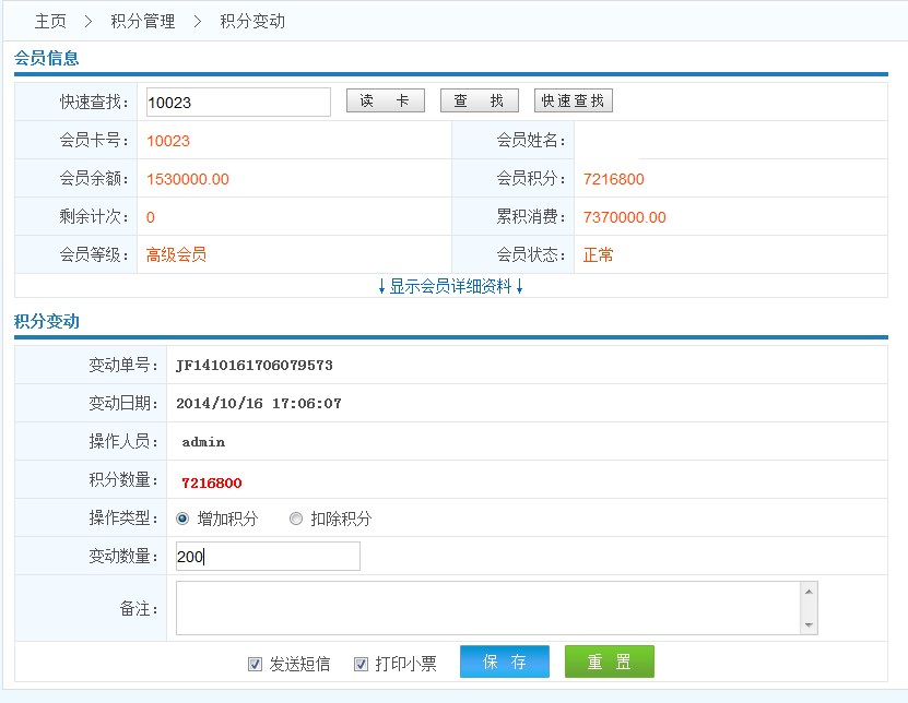 操作流程: 選中會(huì)員------>選擇異動(dòng)類型------>填寫(xiě)異動(dòng)數(shù)量------>提交保存