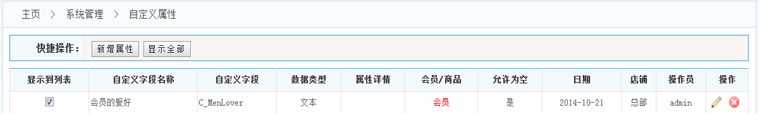 自定義屬性設置:清除全部數(shù)據(jù)、還原測試:給會員新增自定義屬性字段,可在會員列表體現(xiàn).點擊【顯示全部】自定義字段全部顯示在會員列表中