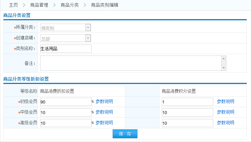 說明:商品分類等級(jí)折扣設(shè)置 這一欄會(huì)展示出系統(tǒng)中的所有的會(huì)員等級(jí)
