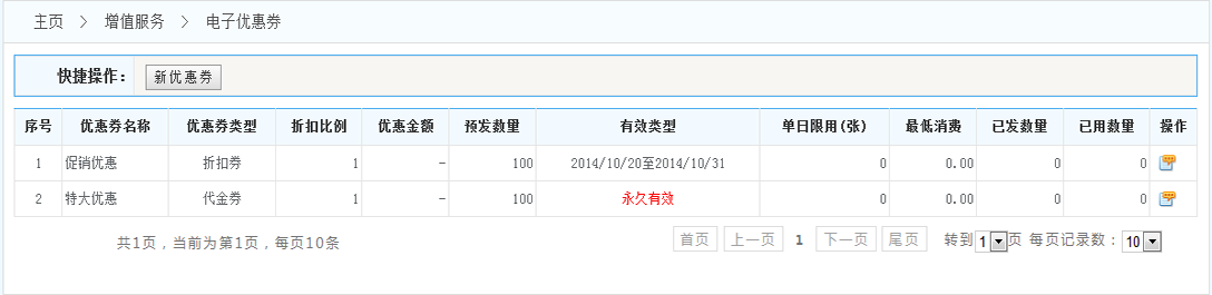 優(yōu)惠類型:本系統(tǒng)提供兩種類型的優(yōu)惠類型分別為 折扣券和代金券